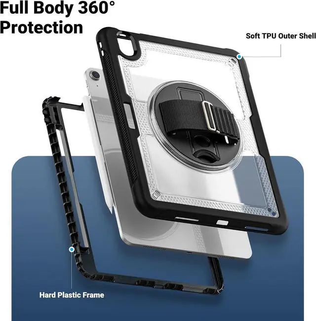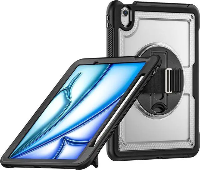 Case for iPad Air (2024) 11-inch M2 Chip Multilayered Rugged Durable Shockproof Tablet Cover with 360° Rotating Hand Strap Foldable Hidden Stand, Transparent