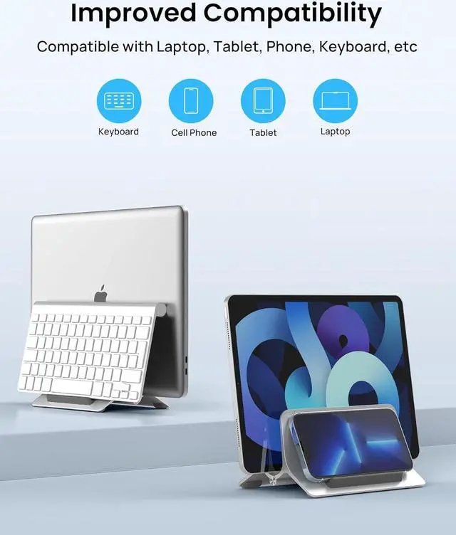 Wide CompatibilityOur vertical laptop stand suitable for all laptops with thickness up to 1.05 inches/27mm. Compatible with 13" Macbook Air, Macbook Air M1&M2, 13"-16" Macbook Pro, Macbook Pro M1&M2 (2019-2023), tablets and cellphones.