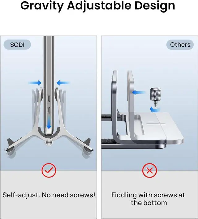 Self-adjustmentEffortlessly adjust your laptop with gravity, with no screws needed or manual adjustments, ensuring a secure fit every time. Fits most laptops and tablets up to 1.05 inch in thickness.
