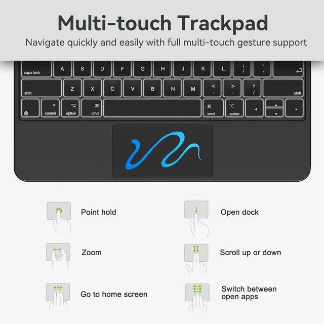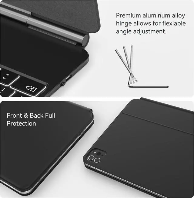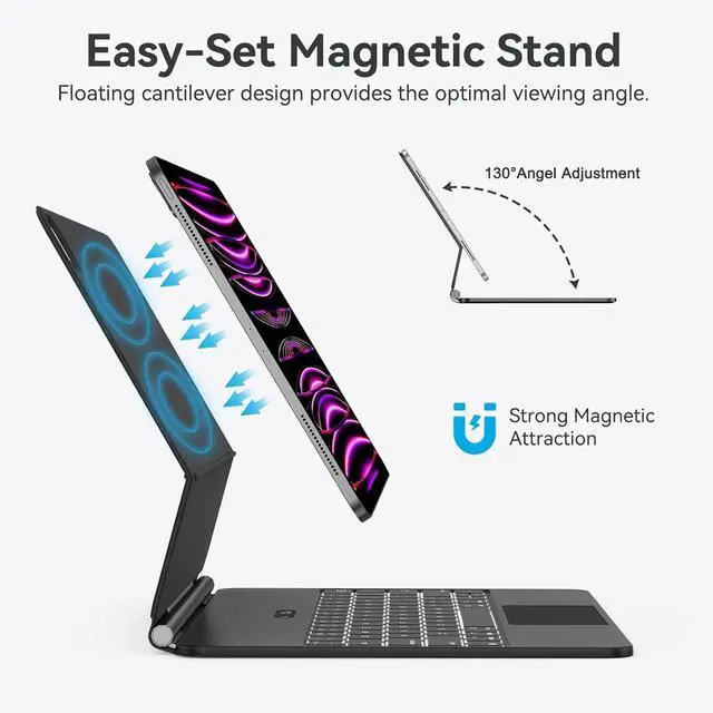 Easy-Set Magnetic Stand: With floating cantilever design, the magic keyboard case can smoothly adjust to the perfect viewing angle. Transform your tablet into a highly performant and easy-to-use laptop within a second!
