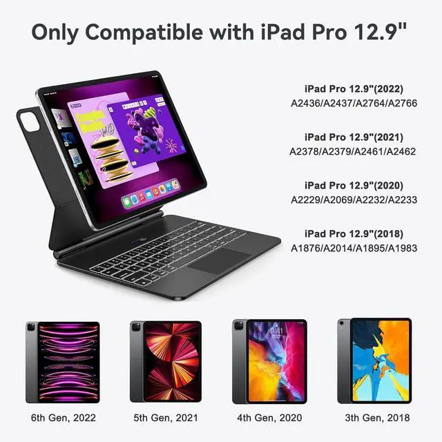 Wide Compatibility: This magnetic keyboard case is only compatible with iPad Air 13-inch 2024, iPad Pro 12.9 inch (6th/5th/4th/3rd gen), models include 2022 12.9inch iPad Pro 6th Generation ; 2021 12.9 inch Pro 5th Generation ; 2020 12.9 inch Pro 4th Generation; 2018 12.9 inch Pro 3rd Generation. Reach out to us if you need to check compatibility.