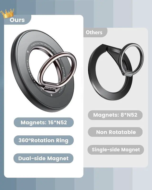 Stronger Magnet & Lighter WeightSODI's magnetic phone ring holder is made up of 16 N52 magnets and has a powerful magnetic force when used with a metal ring, ensuring your phone stays securely in your hand.