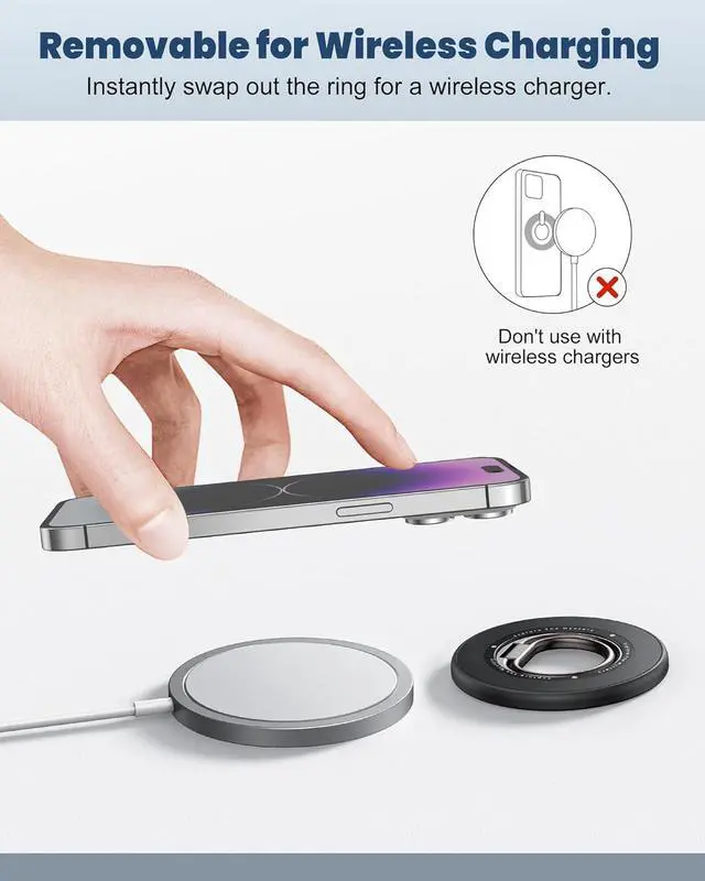 Wireless Charger FriendlyUnlike other rings that can not be removed, our phone ring holder grip can be swapped out easily when you need to charge your phone wirelessly. The extra thin metal ring does not affect wireless charging.