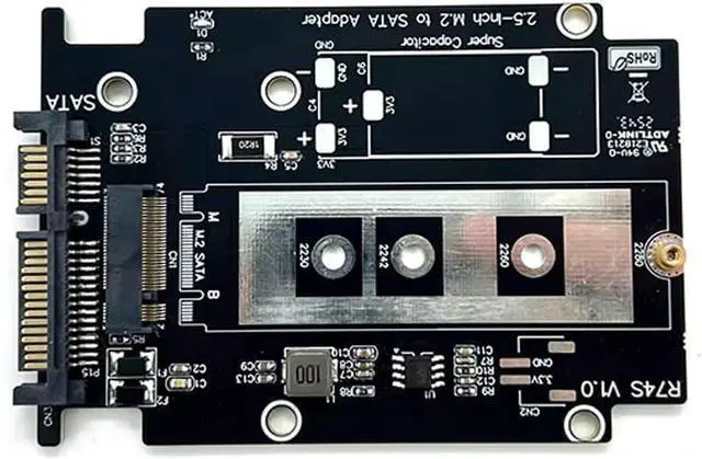 R74S-02F: M.2 (B+M-key) SATA to SATA (Serial ATA) hard drive enclosure, with soldered A 0.022F supercapacitor, Bandwidth SATA 3.0 6Gbps.