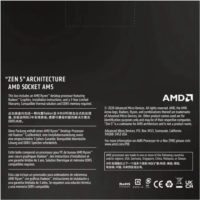 AMD Ryzen 5 9600X Processor (Zen 5) 6-Core 3.9GHz AM5 65W CPU 100-100001405WOF