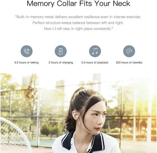 Features: Constantly Comfortable Wearing Experience U-style Collar Provides Cool Wearing Innovative and ergonomic U-style collar shares the weight to shoulders, which further reduces burden on ears. That' s how we create Cool Wearing. Memory Collar Fits Your Neck Built-in memory metal delivers excellent resilience even in intense exercise. Perfect structure keeps balance between left and right. Now L-iFit will stay in right place constantly. Only Amazing Music Reminds You Are Still Wearing Earphones 9mm body fits ears of most people, 2G single earbud meets soft ear gel, that' s how we offers cool and comfortable wearing experience. Sweat Shall Never Disrupt Your Pace Special nano coating and water-proof design help L-iFIT obtain IPX4, which protects the item from sweat even in vigorous exercise