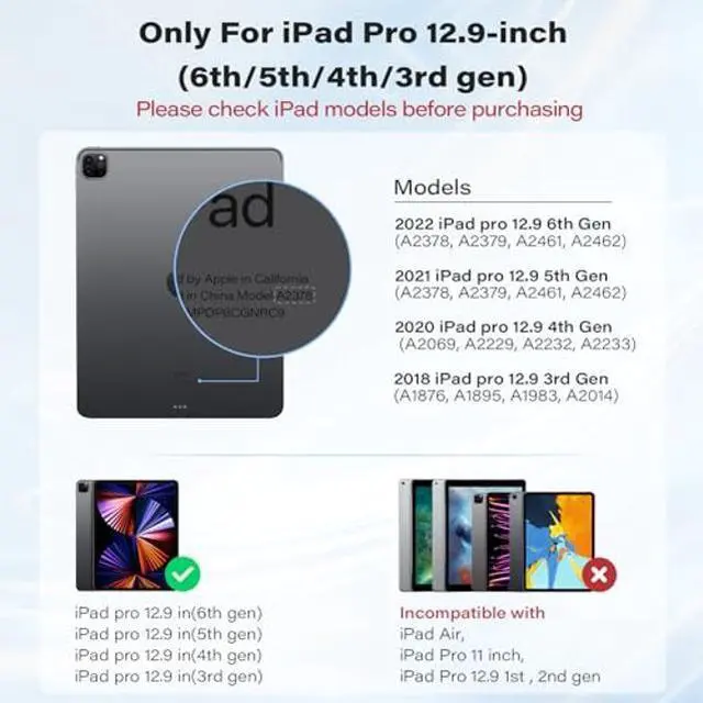 [Compatibility List] The iPad pro magic keyboard only compatible with iPad Pro 12.9inch, models: iPad Pro 12.9inch 2022 6th Gen(A2436/A2437/2764/A2766),iPad Pro 12.9inch 2021 5th Gen(A2378, A2379, A2461, A2462); iPad Pro 12.9inch 2020 4th Gen (A2229, A2069, A2232, A2233); iPad Pro 12.9inch 2018 3rd Gen (A1876, A2014, A1895, A1983). If you're not sure, check out your iPad Pro model and APPS2CAR magic keyboard compatibility list