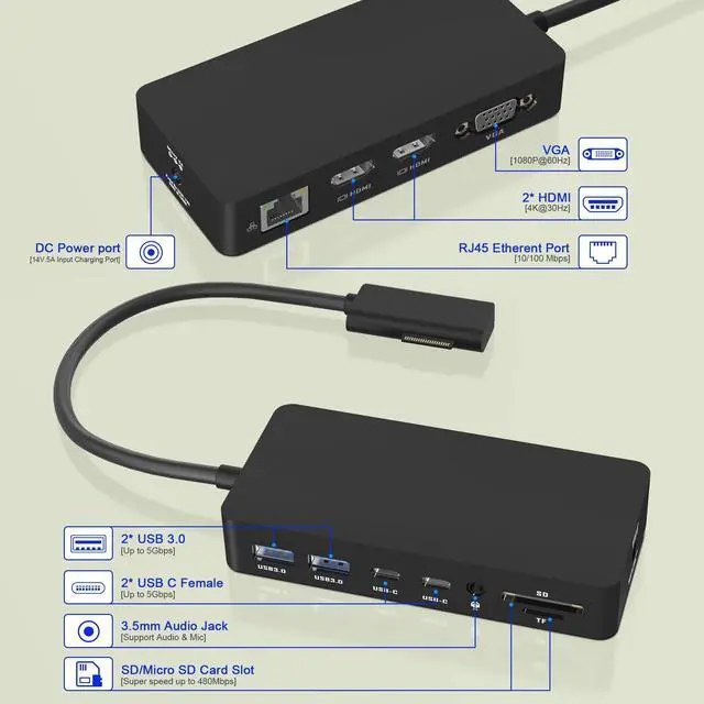 [12-in-1 Microsoft Surface Dock] The surface docking station uses surface connection technology, which can be charged through a cable, and the high-speed transmission of video, audio and data keep your desktop tidy. Surface dock equips with 2x 4K@30Hz HDMI ports, 1080P@60Hz VGA port, 100Mbps Gigabit RJ45 port, 2x USB C port, 2x USB 3.0 Ports, SD/TF card slot, 3.5mm Headphone Jack Port, DC Power Port, Surface dock With simple plug and play connectivity.