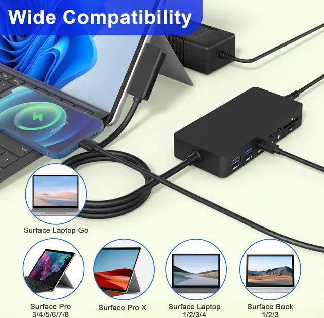 [Surface Docking Station is quick and easy to use] Connect your peripherals to the Surface dock, and then connect the magnetic surface connection cable to your surface device. The surface docking station is compatible with Surface Pro 9/8/X/7/6/4/3/2017, Surface Laptop 4/3/2/1, Surface Laptop go, Surface Laptop, Surface Book3/2/1.(Please connect the magnetic surface connection correctly to your surface according to the direction in Figure 3.)