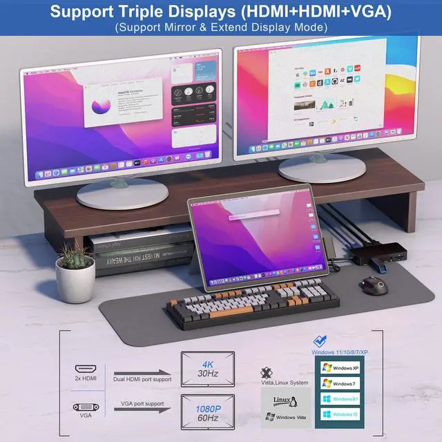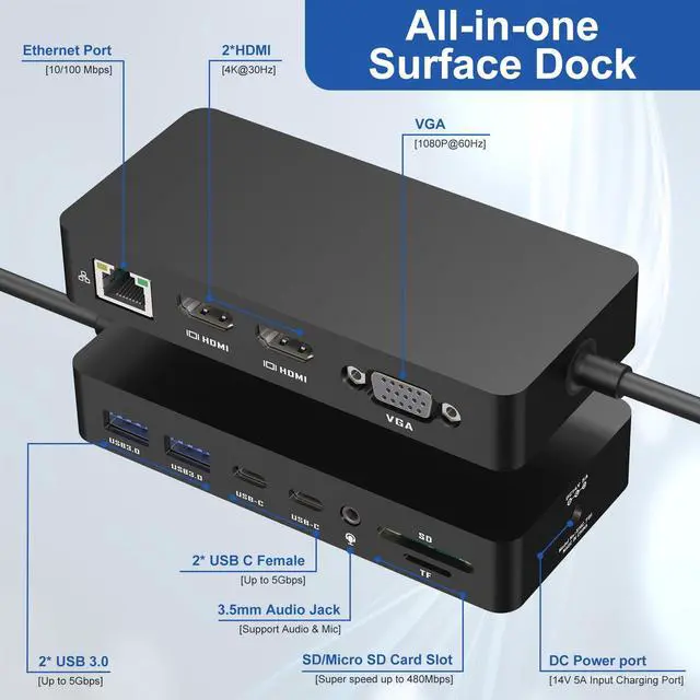 12-in-1 Triple Displays Microsoft Surface Dock: The surface docking station uses surface connection technology, which can be charged through a cable, and the high-speed transmission of video, audio and data keep your desktop tidy. Surface dock equips with 2x 4K@30Hz HDMI ports, 1080P@60Hz VGA port, 100Mbps Gigabit RJ45 port, 2x USB C port, 2x USB 3.0 Ports, SD/TF card slot, 3.5mm Headphone Jack Port, DC Power Port, Surface dock With simple plug and play connectivity.