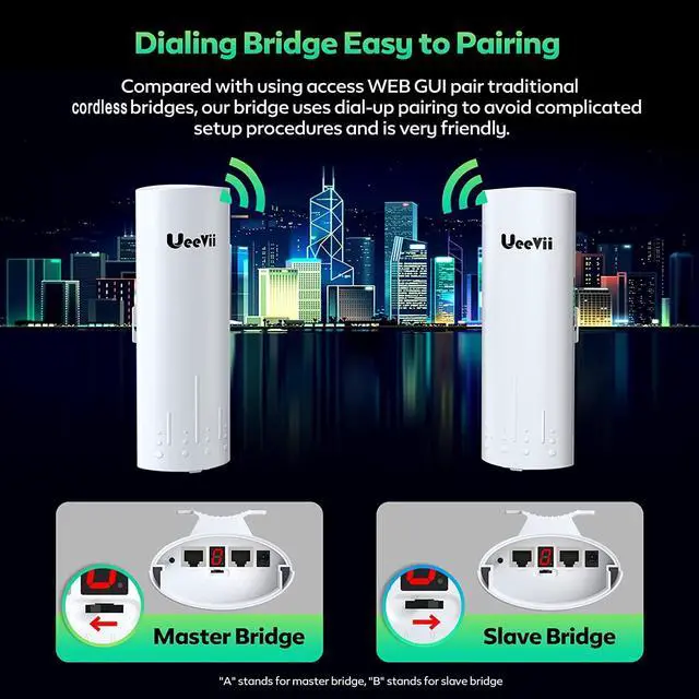1000Mpbs digital display wireless bridge, transmission/receiver automatic networking, support point-to-point, point-to-multipoint, transmission/receiver flexible switching. WDS networking mode, video network dual compatible. The transmission speed between 2 bridges max is 1200Mbps. The highest network speed that can be achieved max is 433Mbpss.