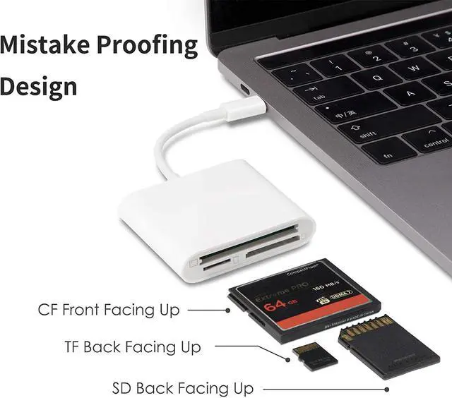 ??USB C Outlet??with USB C connector compatible with USB-C smartphone/laptop/computer. Easy to share photos/HD videos from your SD/TF/CF memory card to your phone and tablet. ?? CF/SD/TF Card Slot??3in1 CF SD TF Card Slot in One Card Reader Support SD SDHC SDXC Micro SD Micro SDHC Micro SDXC CF Memory Cards. Do NOT Support Wi-Fi SD card. ??High Speed Data Transfer??Support fast transfers standard photo formats including JPEG RAW Along with SD and HD video formats including H. 264 and MPEG-4. ??Plug and play??OTG 3in1 Card Reader. No additional Driver/Software/Network required you can easily transfer photos/videos/files from your SD/TF/CF card to a USB-C Smartphone/Laptop/Computer.