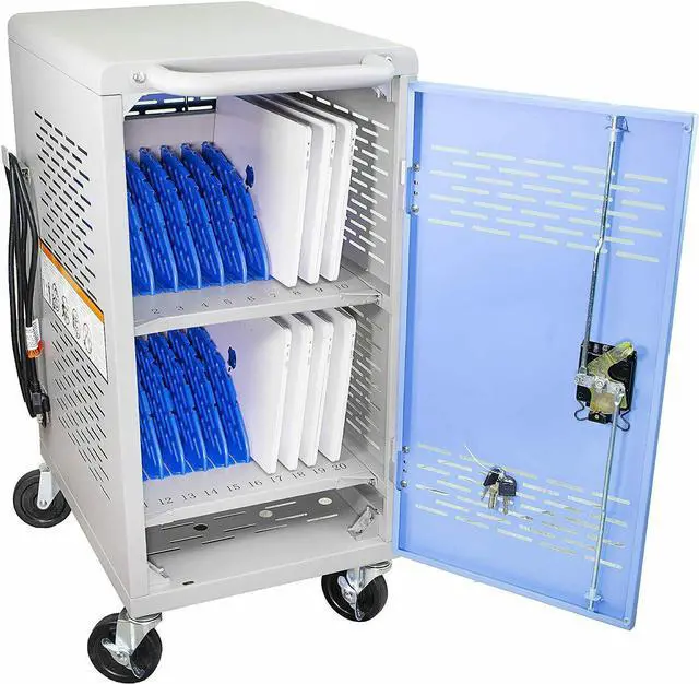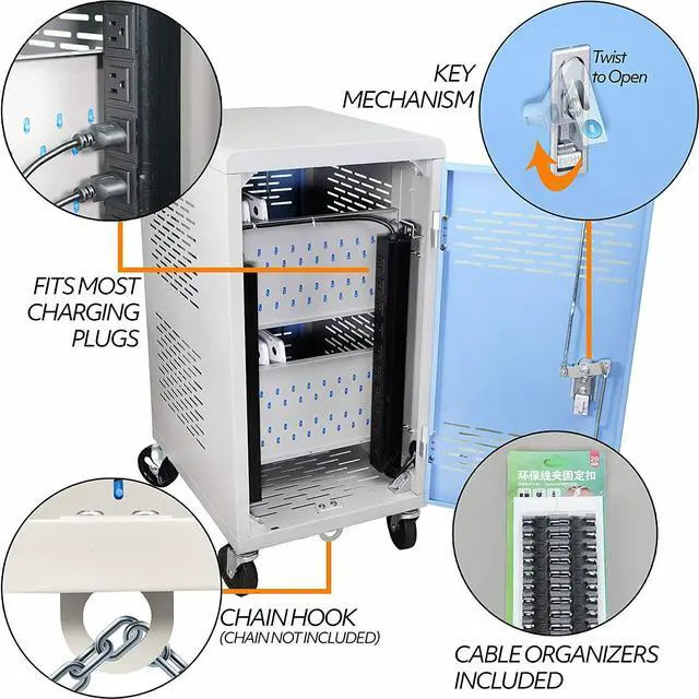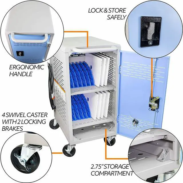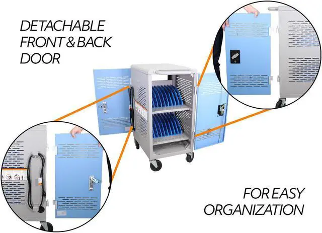 FULLY ASSEMBLED Say goodbye to tedious assembly! POCHAR's 16-unit laptop charging cart comes fully assembled - all you need to attach are the wheels, handlebar, and power cord racks on the side. Hardware is included with this charging station for laptops for immediate usage! SAFETY DESIGN Our laptop charging carts have rounded corners on the top to prevent injuries in busy spaces, and the steel frame can support up to 200 lbs. All sides of this laptop charging station for multiple laptops ensures great air flow for our ventilated storage cabinet. DETACHABLE DOORS Both doors of our laptop rack for multiple laptops can be completely removed, so you do not have to constantly pushing the doors away while organizing the tablets.