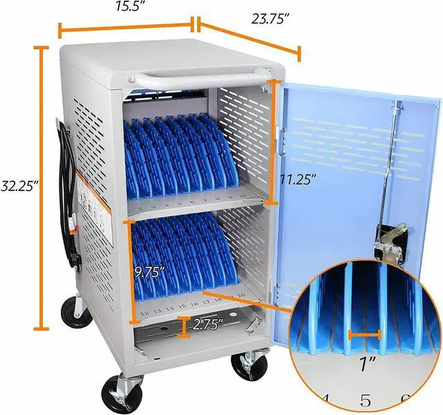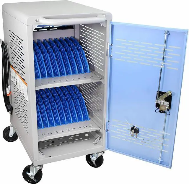 Once you are ready, simply put the doors back and turn the lock to secure the devices. USER FRIENDLY Our C16 tablet charging cart comes with 3-inch compartment at the bottom for storing your chargers. Each outlet and divider corresponds to one device for optimized management. In addition, this cart has printed numbers in the front for easy and quick identification.