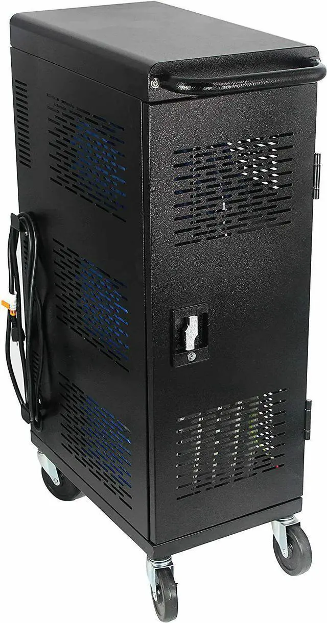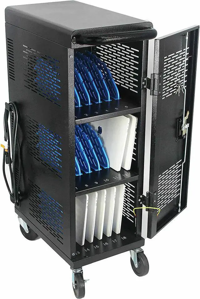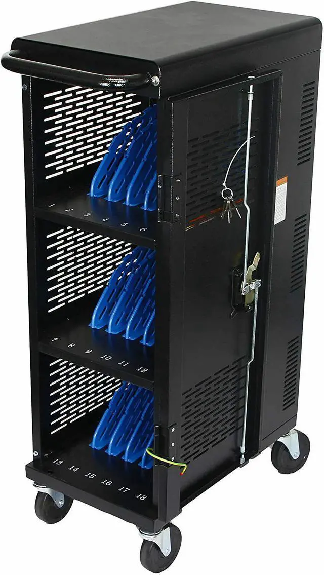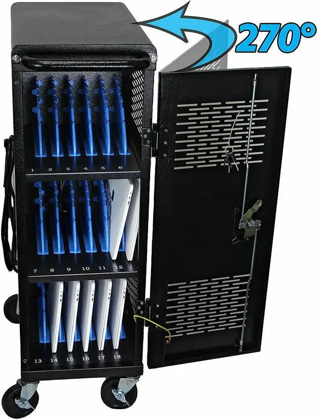SAFETY DESIGN Our laptop charging carts have rounded corners on the top to prevent injuries in busy spaces, and the steel frame can support up to 200 lbs. All sides of this laptop charging station for multiple laptops ensures great air flow for our ventilated storage cabinet. DETACHABLE DOORS Both doors of our laptop rack for multiple laptops can be completely removed, so you do not have to constantly pushing the doors away while organizing the tablets. Once you are ready, simply put the doors back and turn the lock to secure the devices.
