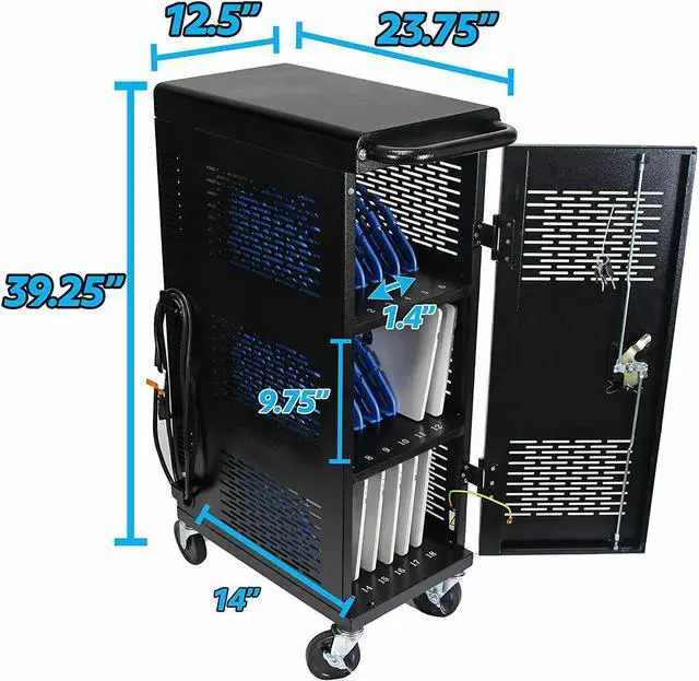 USER FRIENDLY Our C16 tablet charging cart comes with 3-inch compartment at the bottom for storing your chargers. Each outlet and divider corresponds to one device for optimized management. In addition, this cart has printed numbers in the front for easy and quick identification. FULLY ASSEMBLED Say goodbye to tedious assembly! POCHAR's 16-unit laptop charging cart comes fully assembled - all you need to attach are the wheels, handlebar, and power cord racks on the side. Hardware is included with this charging station for laptops for immediate usage!
