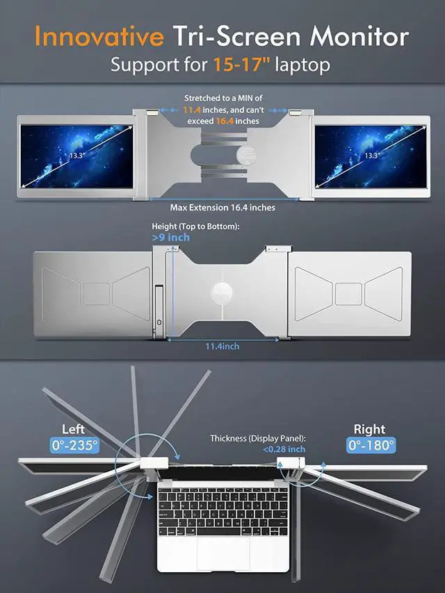 The FOPO tri screen portable monitor for laptop allows you to easily handle multi-tasks and improve your work efficiency by up to 300% without top switching workspaces back and forth.