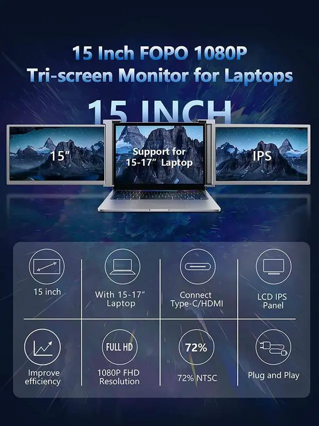 Perfectly combine a large screen and high definition. FOPO portable triple screen monitor has a resolution of 1080P and is paired with a 15" IPS FHD screen. When using this monitor, you can get a more comfortable visual experience. Enough to meet the visual requirements of the game and design.