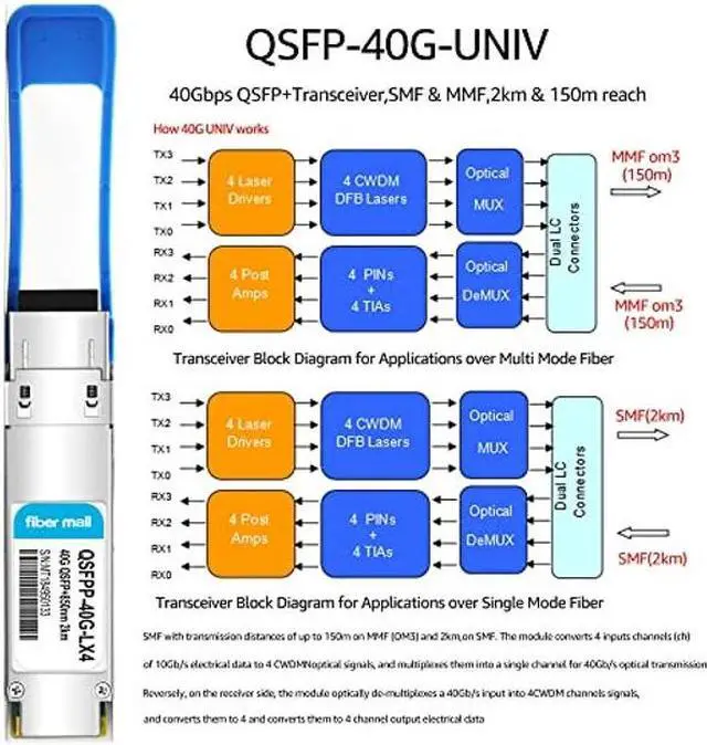 Fiber Mall for Cisco QSFP-40GUNIV Compatible QSFP+ Optical Transceiver Module is applied to 40GBASE Ethernet transmission with links up to 150m/2km over OM3/SMF repsectively, which is compliant with the QSFP+ MSA and IEEE 802.3 ba 40GBASE-LM4 standards.