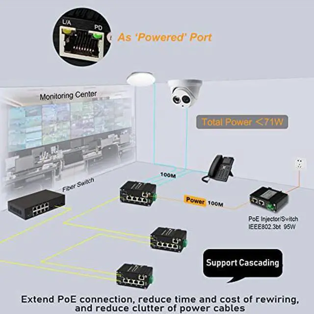 [(PoE Passthrough)] - When the powered port is in use, IEEE802.3bt PD PoE++ port with 95W power input, four PSE IEEE802.3af/at/bt PoE+ output ports, PoE power budget up to 71W.