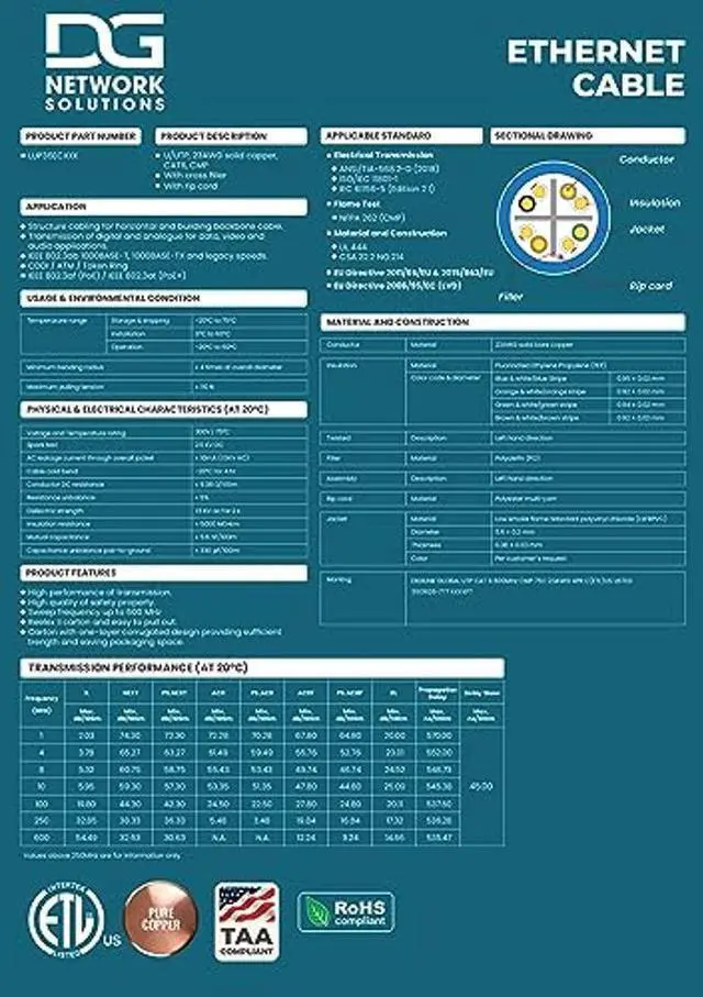 DG Network Solutions offers reliable high end solid bare copper cable for high speed Ethernet. Future proof your network with CAT 6E 600MHz, 10Gigabit Speed. Digilink CAT6E cables are made of 100% pure bare copper, which complies with UL Code 444 and ETL Standards. Solid bare copper also provides better flexibility and performance than copper clad aluminum.