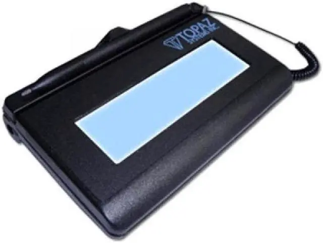 The Topaz SignatureGem LCD 1x5 is an advanced electronic signature pad with backlit transflective LCD that displays "electronic ink" under the pen tip during signing.