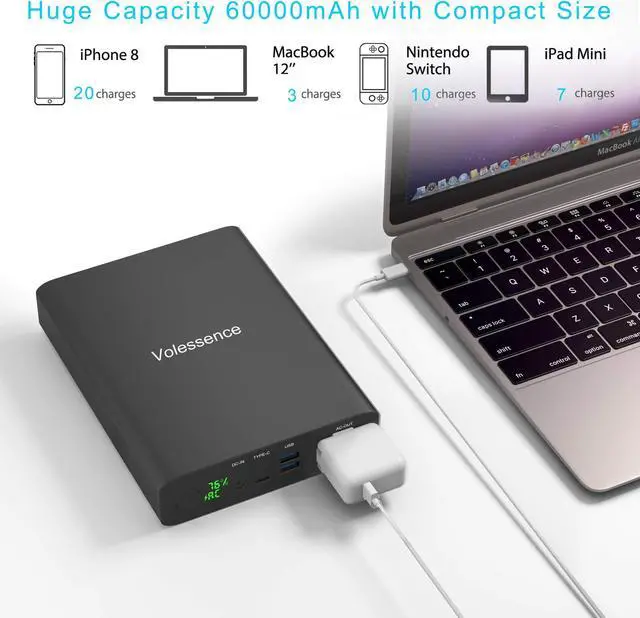 With 60000mAh, Volessence AC power bank can charge iPhone 7/8 x 20, iPhone 7/8 Plus x 12, Galaxy Note 8 x 12, 12'' MacBook x 3, 15'' MacBook Pro x 1.5. It ensures enough power during your trip and brings you a convenient life.