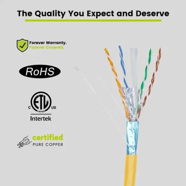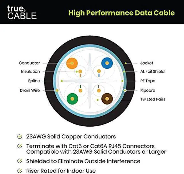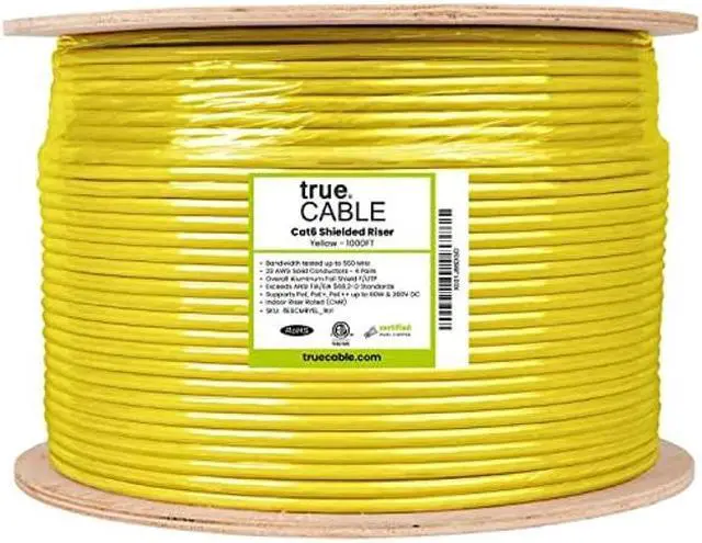 HIGH PERFORMANCE NETWORK CABLE. This riser rated cat 6 lan cable is 23 AWG with 4 pairs (8C). The overall aluminum (AL) foil shield helps eliminate cross-talk and prevents electromagnetic interference (EMI). Suitable for 1 and 5 Gigabit speed up to 328 feet and 10 Gigabit speed up to 165ft depending on the installation environment. Bandwidth tested up to 550 MHz. Supports Power over Ethernet: PoE/PoE+/PoE++ (IEEE 802.3af/at/bt) 4PPoE up to 100W.