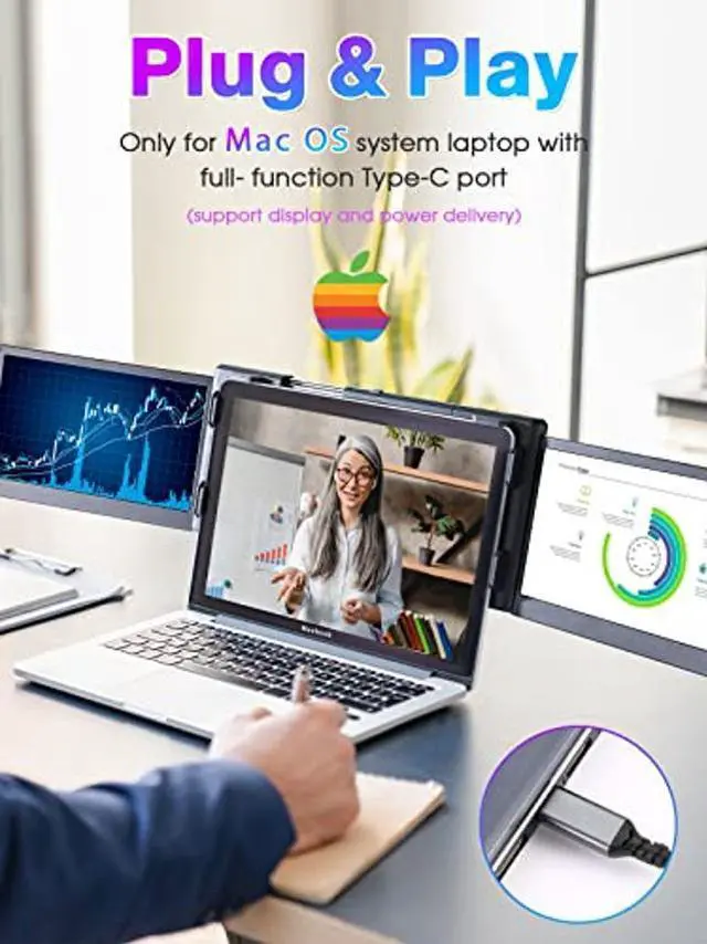 [(Only One Cable Needed)] Suitable for 13.3"-16.5" Laptops, Compatible with Macbook system laptop by only one type-C cable if the type-C port of your laptop can supply over 5V2A power, and no need driver installation,then you can light up the whole two screens of the laptop 3 screen extender.(Note:Pls make sure that your laptop has full function type C port which support power,data transmission and display,such as thunderbolt3 and thunderbolt4)