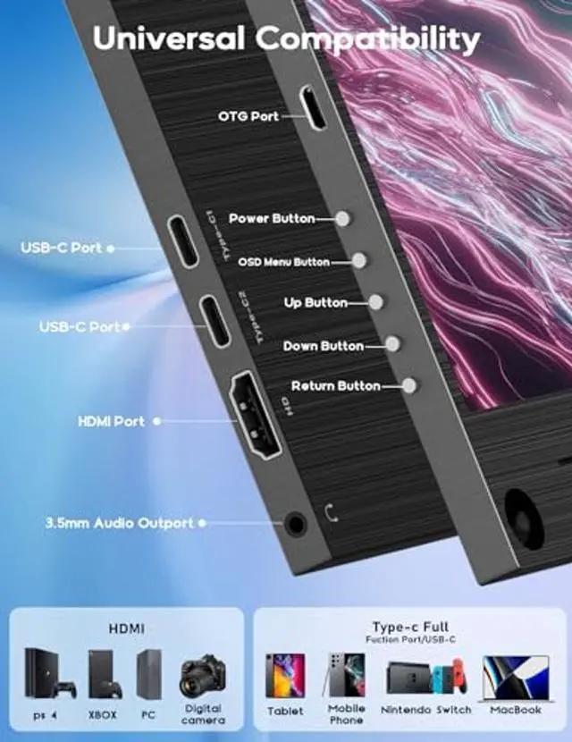 1 x 4K Portable Monitor 1 x Smart Cover 1 x USB-C to USB-A Cable 1 x USB-C to USB-C Cable 1 x Mini-HDMI to HDMI Cable 1 x 5V 3A Wall Charger 1 x Friendly User Manual