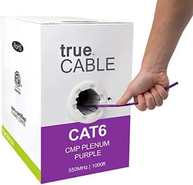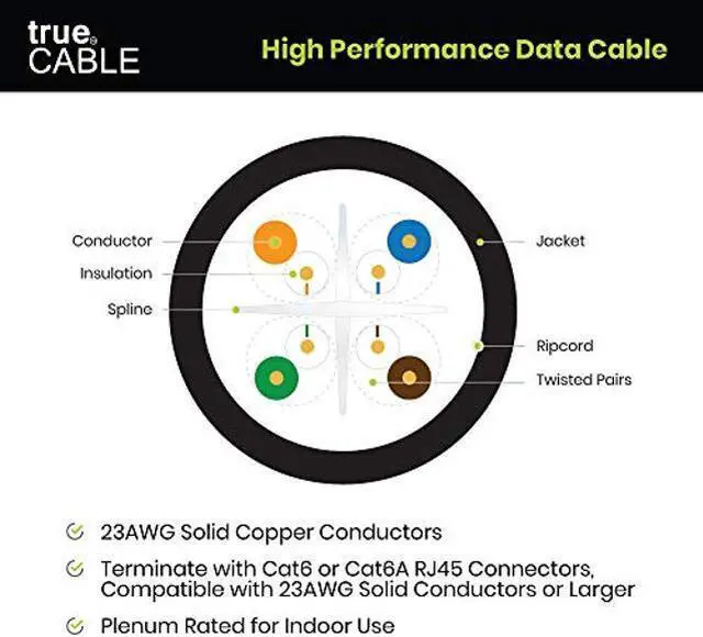 Cable Construction: Plenum Rated PVC Jacket (CMP) - Fluorinated Ethylene Propylene Insulation (FEP) The center separator/spline provides the cable extra support to help fight against twists and kinks. It also separates the pairs to further eliminate crosstalk. Our cables are manufactured with 100% bare copper wire, NOT copper clad aluminum (CCA) wire. Please reference our trueCABLE spec sheet image for complete product information. Supports all your devices TV Server Media Server Gaming Console Wi-Fi Router Printer Computer/Laptop Telephone Commonly referred to as: Cat6 Cable Cat6 Ethernet Cable Cat 6 Network Cable Phone Cable LAN Cable RJ45 Wire Category Cable