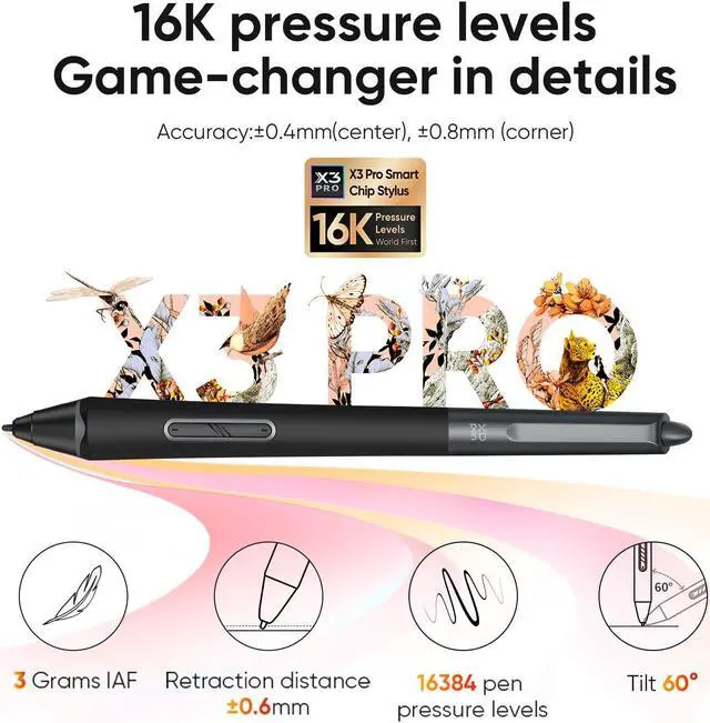16K Pressure Sensitive: XPPen Artist Pro 16 Gen2 drawing tablet introducing X3 Pro smart chip stylus is a breakthrough innovation boasting industry-first 16K pressure levels, 100%* higher than that of its peers. It delivers much more precise and smooth lines than ever before, excelling at hyper-nuanced creation, a game-changer in details.