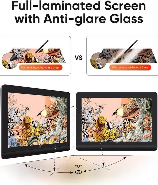 2.5K QHD Screen: The 16-inch graphic tablet's display adopts 2560x1600 QHD resolution, full laminated technology, anti-glare etched glass, 16:10 aspect ratio, wide angle of 178deg, which all will help you avoid parallax errors between the stylus nib and cursor, precisely positioning every single one of your strokes. TUV SUD certified optimizes eye comfort by reducing potentially harmful blue light emissions while delivering excellent color accuracy.