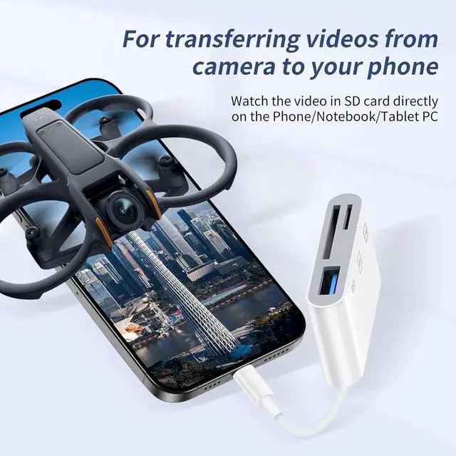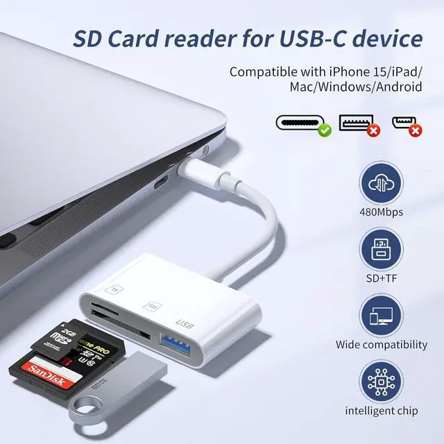 SD Card Reader USB C plug and play two-way transfer no third party APP no network no driver no extra power Easily browse and copy photos and videos from your cameras and quickly share your beautiful moments 3 in 1 sd card adapter is a useful accessories for photographersUSBC SD Card Reader compatible with iPhone 15 16 series/ipad/ipad pro/mini/air with USB connector compatible with /Galaxy//Thinpad also compatible with Android phone/tablets/laptop with USB-C Type C connectorSD card reader Designed for Photography Creators speed transfer speed of 30-60 MB/s Compatible with SD SDHC SDHC SDXC Micro SD Micro SD Micro SD Micro SDHC Micro SDXC cardSD Card reader for iphone usb c Have usb female Port Extend can connect USB peripheral device SD card and Micro SD card cannot be reading simultaneously can be recognized simultaneously with USB peripheral.