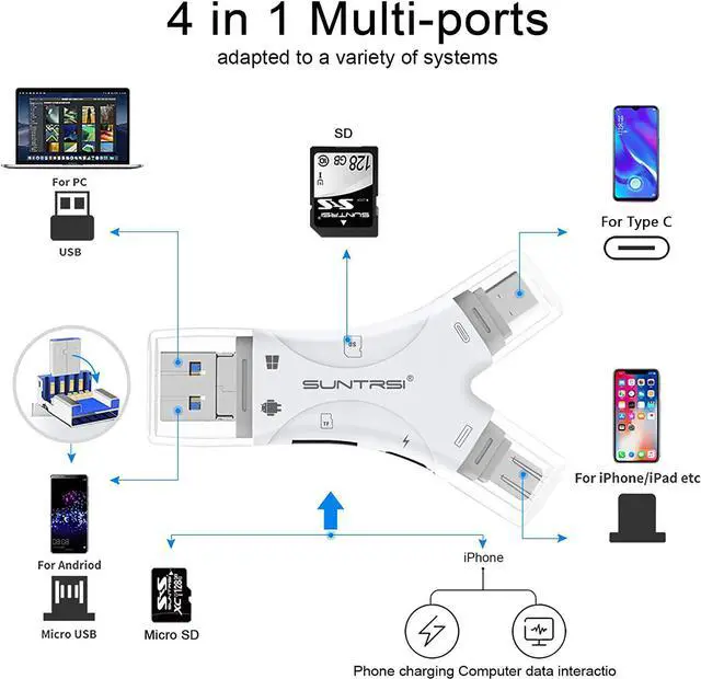 SD Card Reader: The memory card reader has various interfaces usb / usb c (type c) /micro usb/sd card slot/micro sd card slot and iOS devices charging port for iPhone/iPad which allows you to easily transfer the required files between different devices.