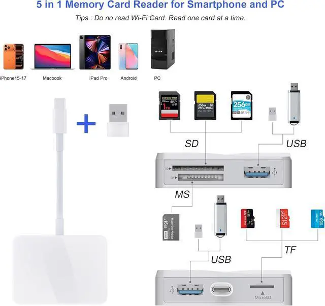 [Dual Connectors Design]: This product compatible with USB-C and USB ports (includes a detachable USB-C to USB adapter). Simply plug the USB-C connector into devices like iPhone 17/16/15 Pro Max iPad Pro Mac Android phones or PCs or attach the USB adapter for older computer devices. This versatile setup enables seamless cross-platform data transfers move photos videos and files between iOS Android Windows and macOS systems with full OTG support. [SD/MicroSD/MS Triple Card Slots] This card reader usb c gives you the flexibility and convenience of accessing multiple types of memory card. With support for reading and writing large capacity up to 2TB you can easily review files or back up and archive photos and videos compatible with SD SDHC SDXC Micro SD TF Card Micro SDHC Micro SDXC UHS-I UHS-II Camera Card and so on. [Accessories for Macbook with Dual USB Female Port] This converter not only has a Triple card slots but also Dual USB interface which can read and write from one card and dual usb ports at the same time. It is a good partner for MacBook and iPad Pro. This USB C to USB Adapter Compatible with USB devices like Digital camera/SLR/USB Flash drive/Keyboard/Mouse and so on The USB Adapter built-in newest chip not only can quickly and smoothly speed up the transfer but also can ensure transfer safety.