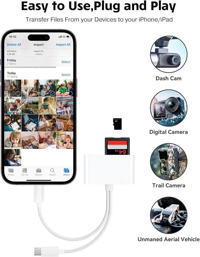 Connector and USB-C): This SD card reader features both an iPhone connector and a USB-C connector allowing it to work with a wide range of devices including iPhone 5 to 14 series as well as USB-C iPhone 15 and 16 iPad MacBook Mac computers laptops and Android devices.
