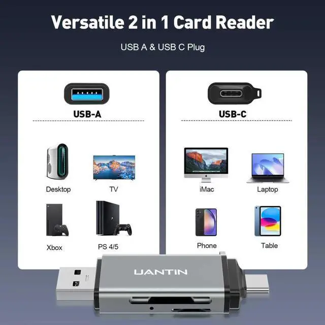 USB-A and USB-C dual-header design makes this memory card reader ideal for photographers and video editors who want to manage files quickly and efficiently as well as outdoor shooting enthusiasts. Portable & Durable DesignSturdy case worry-free on the go. This slim and lightweight sd card reader is designed for easy portability. Protective covers on both ends keep dust and liquids out and the included keychain allows you to attach it to your backpack or other items to prevent loss and easily access your micro/sd card when needed say goodbye to storage anxiety! Worry-Free] UANTIN high-speed card reader with built-in smart chip ensures secure file transfer and avoids the risk of data loss cargo equipment damage.