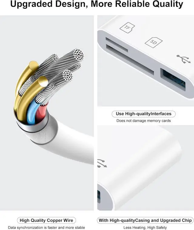 Universal Compatibility: The upgraded SD card reader has dual connectors-USB C and Lightning designed for iPhone between 5 to 16 series in addition to iPad Macbook Laptop or Android devices. It is compatible with iPhone 17/17Pro Max/17e/Air/17 Pro/16 Pro Max/16/16e/15/15 Pro Max/14 Pro Max/14/13/13 mini/13 Pro/12/12 Pro/11/XS/XR/X/8 Android S26/S25/S24/S23/S22/S21/A16/A15/A14/A56/A55/Note 20/Z Flip/Z Fold Google 10/10 Pro/10 Pro XL/10 Pro Fold/9Pro XL/9Pro/8/7A/6/5/4XL iPad Pro/Air/Mini and more.