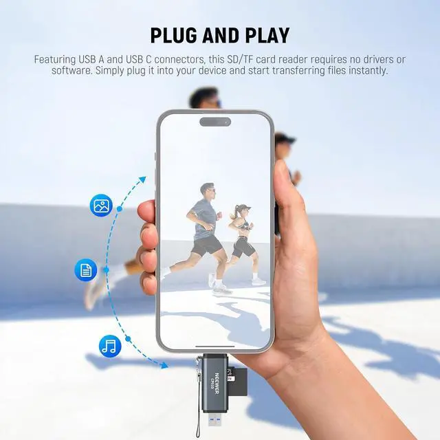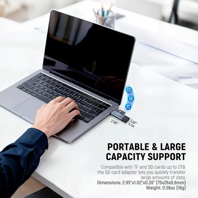 Access and manage files stored on your TF cards with ease including work files presentations selfies short videos for TikTok clips Instagram Reels YouTube social media content livestream recordings music and other mediaPlug and Play Featuring USB A and USB C connectors this SD/TF card reader requires no drivers or software. Simply plug it into your device and start transferring files instantly. Compatible with Windows XP/7/8/10/11 Mac OS v 10.0 and later Android HarmonyOS and iOS 15 and laterPortable & Large Capacity Support Compatible with TF and SD cards up to 2TB the SD card adapter lets you quickly transfer large amounts of data.