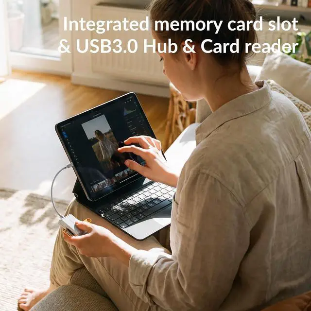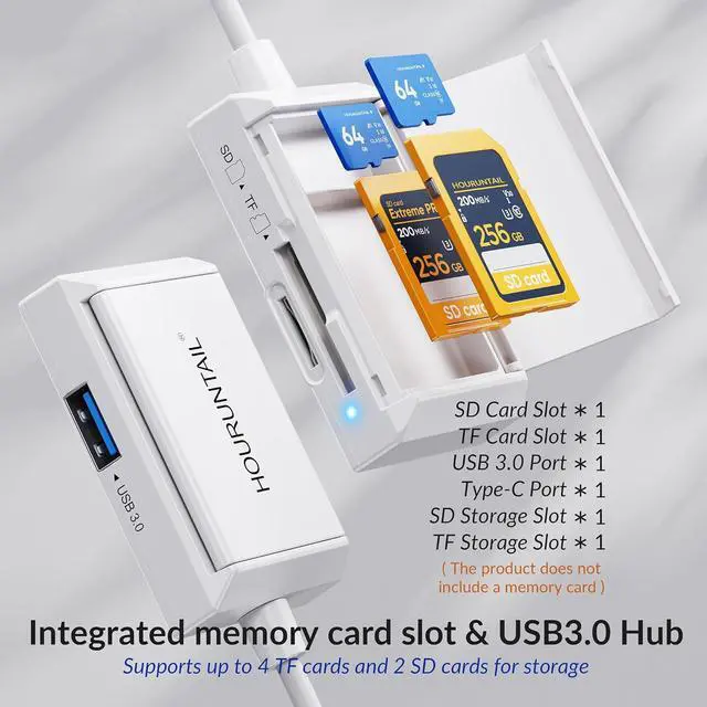 Plug and PlayHOURUNTAIL SD card reader With the built-in expansion USB-C cable of this sd card reader usb c you can save space and use ports side by side Friendly and compact port design. No third party APP No network No driver No extra power plug and play. SD / TF / USB 3 Portsaccess multiple types of memory cards flexibly compatible different memory card: SD Card / SDHC / SDXC / Micro SD / Micro more. Simultaneous Dual-Card TransferBoost productivity with dual slots that read/write SD and Micro SD cards at the same time. Perfect for photographers videographers or content creators managing files across cameras drones or gaming consoles. Ultra-Portable Storage SolutionCompact credit-card-sized design fits in any pocket or bag. Organizes to Micro SD and SD cards in its included caseperfect for on-the-go professionals or travelers needing quick reliable access to files. Widely Compatible This Type C SD card reader is compatible with i-Phone 15/i Phone 16/i Pad/with a USB-C connector. Installation for Windows 11/10/ 8.1 /8/7/XP/Vista/macOS/Chrome/Linux the sd card reader for Android.