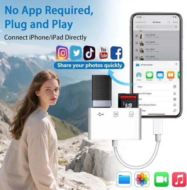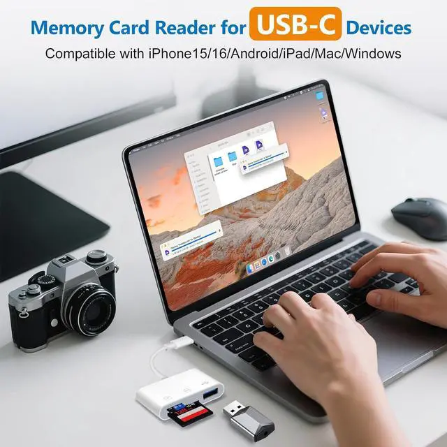 Play: This USB-C SD card reader is compatible with iOS MacOS Windows and Linux. Plug memory card reader into the iPhone's port and use iOS built-in Photos to import photos videos or use the iOS built-in Files to import and export any files. No network or special setup required no drivers no caching no app required and recognizes the memory cards directly.