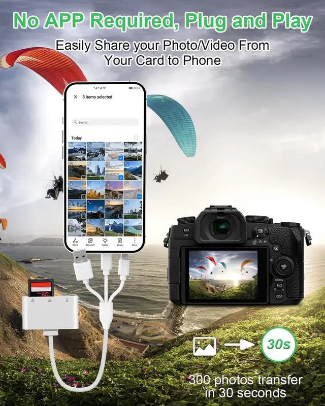 Compatible: Supports SD SDHC SDXC microSD microSDHC microSDXC and XD memory cards offering a versatile all-in-one solution. The triple-slot design of the XD card adapter enhances efficiency and convenience allowing you to read multiple memory cards without carrying multiple card readers. Triple-Interface Design - This sd card adaptor features both L-ightning USB-C and USB-A interfaces supporting a wide range of devices including iPhone 5 through 14 series as well as iPhone 15 and 16 iPad MacBook Mac computers laptops and Android devices. High-Speed Data Transfer - i-Phone sd card adapter type c is equipped with an advanced integrated circuit chip this iPhone SD card reader achieves transfer speeds up to 480Mbps. It supports high-definition movie transfers completing transfers in just seconds to save significant time. Plug and Play - When using xd card adapter no applications need to be installed. Simply plug it in and wait 5 seconds after connecting the device. Compact and wired design Slim lightweight and durable easily fits in your pocket or camera bag. The wired system of the xd picture card reader won't block other ports on your device. Perfect for travel remote work or on-location shoots.