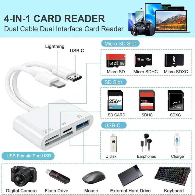 Please note: This card reader does not include an SD card. High-Speed Data TransferThe high-speed two-way transfer from SD card reader It enables quick transfers of standard photo formats including JPEG RAW and 4K video formats allowing you to move large volumes of photos and files in seconds can save you a lot of waiting timeMulti-function: It can connect more USB peripherals such as camera USB flash drives card reader etc. Supports two-way to stable transfer files/photos/music/video from SD card to iphone/ipad or from iphone/ipad to memory cards. to Enjoy faster and easier chatting and typing while workingWide compatibility: Compatible with iOS/Windows/Mac OS/Linux/Android and other systems no driver required enjoy plug-and-play experience; no additional power charger required super easy to useDo the