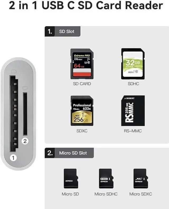 Slot Design: Read both full? size SD and MicroSD (TF) cards simultaneouslyno extra adapters needed for your DSLR mirrorless tablet or phone.? High?