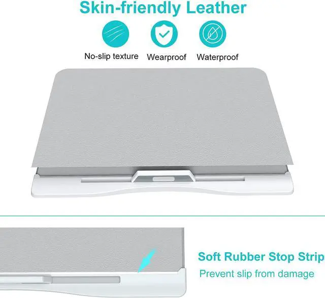 Multifunctional Laptop DeskKLEAR:Fill Your Life with ConvenienceLap desk table for reading on the bed Laptop stand for working on the sofaLaptop bed tray for painting outdoorsBed table tray for eating on the floorErgonomic Design FoldableBed DeskPVC leather desktop, the smooth surface make the mouse on the desk as smoothly as on a mouse pad.