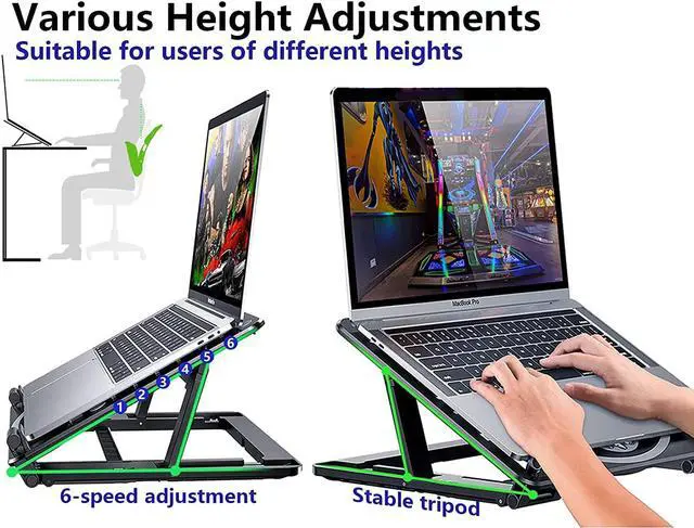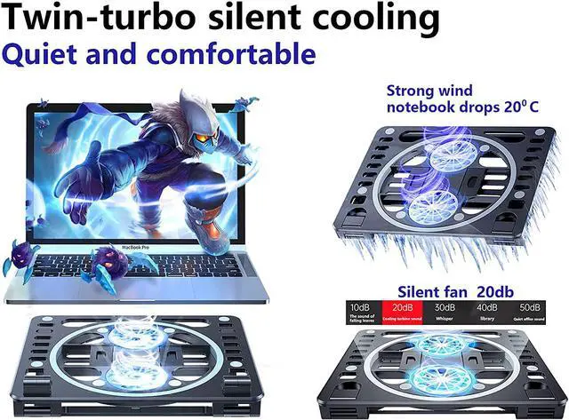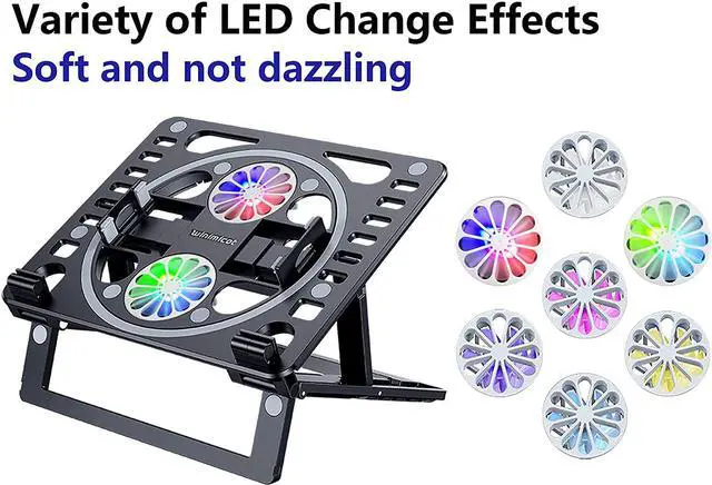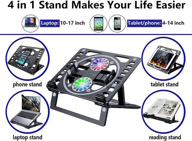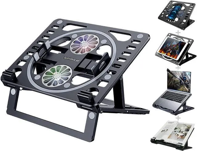 4 in1 Laptop Cooling PadThe Winimicot Laptop Cooling Pad with to Meet all your needs at once: laptop stand tablet stand phone stand and book clipUltra-quiet fansTwo ultra-quiet fans (20dB) create a noise-free environment for youand make The laptop cools down quickly. Using USBC power Gradual rainbow-colored LED lighting soft and coordinationUltra-portable useThis Cooling Pad provides you 6 height levels adjust and 180 rotatable Fan tray for better viewing and typing experience which help to relieve neck pain caused by prolonged computer use and incorrect postureDurable & Non-slipMade of high-quality Engineering Plastic its bracket weighs 590g which is more sturdy and durable. There are Multiple non-slip silicone pads on the stand to ensure the laptop is fixed in place and to protect your equipment froming sliding down or falling offStrong CompatibilityCompatible with various laptop sizes from 10 to 17 inches such as Apple Macbook Pro Air HP Alienware Dell Lenovo ASUS and Various sizes of mobile phones/tablet etc.