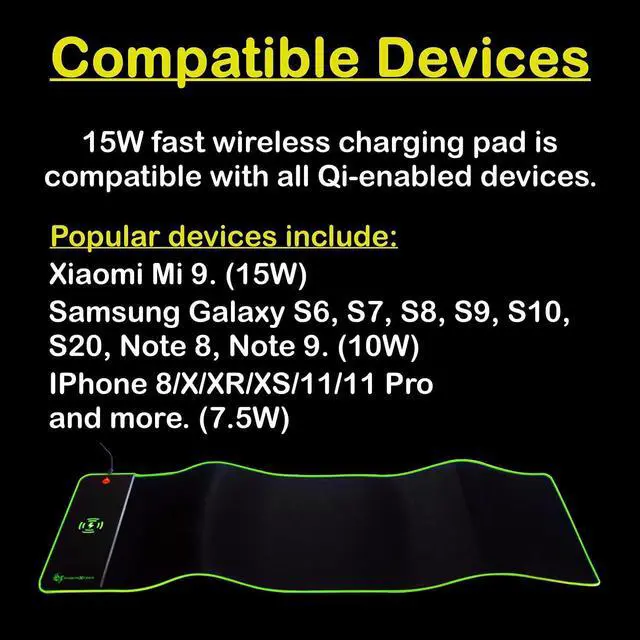 Charging Pad:? Fast wireless charging pad is compatible with all Qi-enabled devices such as Samsung Galaxy S6 S7 S8 S9 S10 S20 Note 8 Note 9 (10W). iPhone 8/X/XR/XS/11/11 Pro and more ( 7.5W ). Xiaomi Mi 9 (15W).
