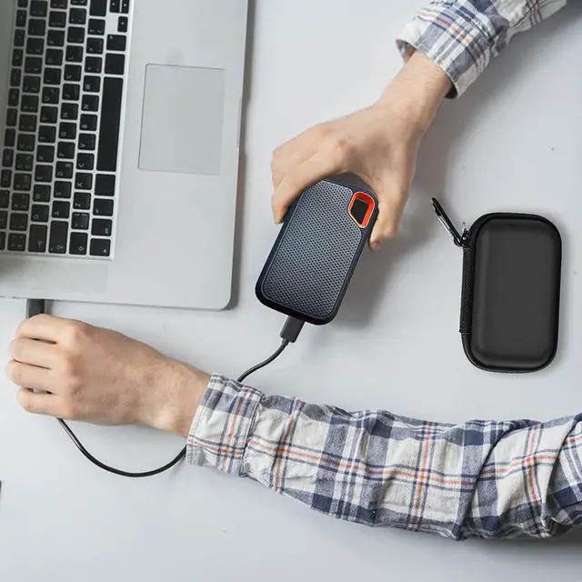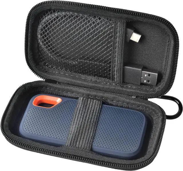 SSD external hard drive case: Portable ssd storage fits for sandisk ssd/ for sandisk extreme pro 1TB 2TB 4TB 500GB 250GB for SDSSDE81-1T00 2T00 4T00-G25/ SDSSDE80-1T00 2T00-A25/ SDSSDE61- 500G 1T00 2T00 4T00-G25/ SDSSDE60-25 500G 1T00 2T00-G25 External Solid State Drive (For sale is case only not include external ssd) Protector for sandisk extreme portable ssd: Solid state external hard drive organizer is made of great PU good water-proof dust-proof and crush resistance provides excellent protection for sandisk 1tb external hard drive. ssd 2tb holder with durable elastic strap inside hold ssd hard drive securely. With good elasticity it is convenient to take external solid state drives out and put it in. Hard case for sandisk portable ssd: external hard drive ssd bag with a small mesh pocket fit cable and adapter nicely inside. So that you can quickly find all accessories when you need to use them. The box for sandisk hard drive has a 360-degree smooth zipper for easy opening and closing. Portable design for sandisk ssd case: hard drive storage case for san disk ssd comes with a carabiner make you hang the case on your backpack and take 4tb ssd external hard drive to trips easily. The container for sandisk 2tb extreme portable ssd is also lightweight so that you can carry it with one hand easily and you can put it in drawer on shelf for safe storage.
