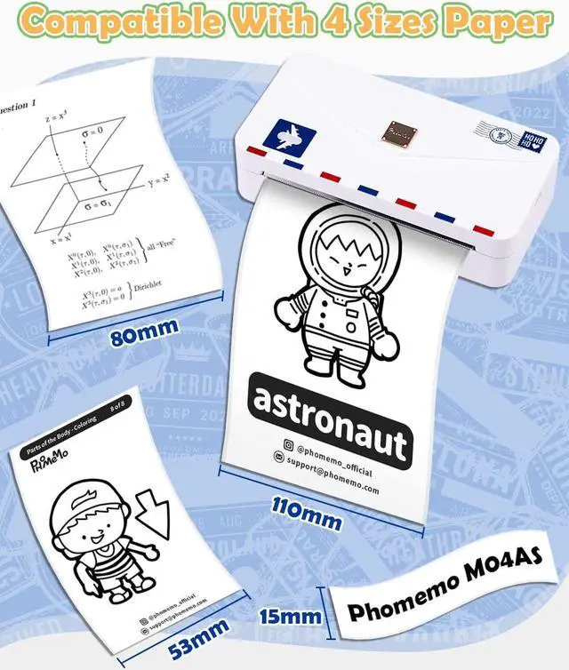 4 In Portable Thermal Printer- Phomemo M04AS has cute stylish design, compact and portable. Compatible with 15mm/53mm/80mm/110mm size thermal paper. Multi printing width make this thermal printer is great for printing labels, photos, notes, stickers and documents.